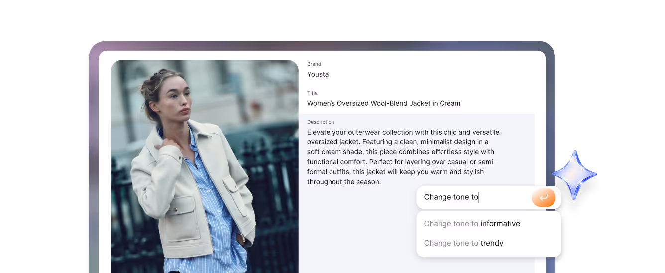 Enrich catalogs faster with AI. Fill missing attributes, remove duplicates, and generate marketplace-ready exports using images, files, and smart prompts.
